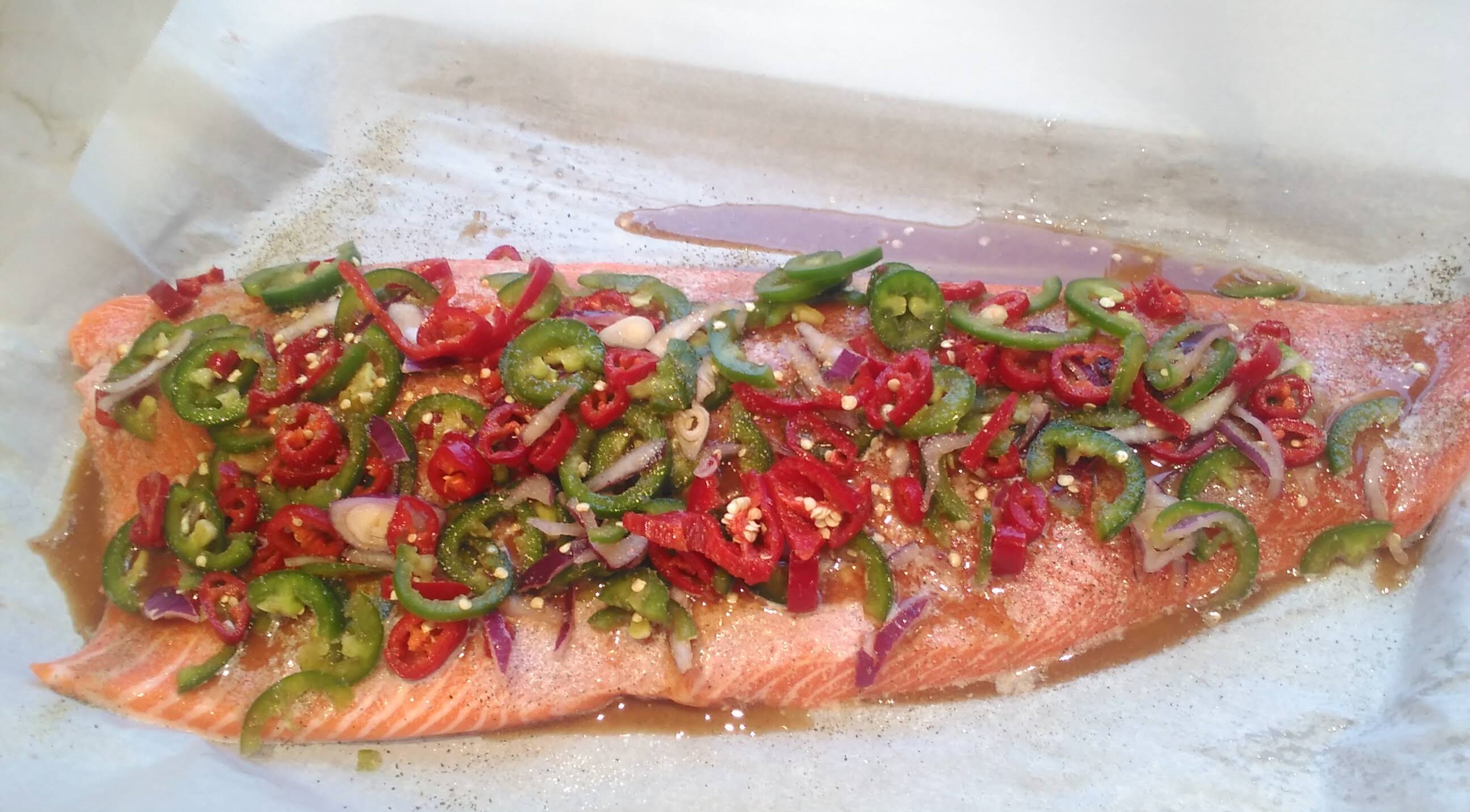 - Evenly apply the spicy topping mixture over the salmon fillet, making sure it’s fully coated.